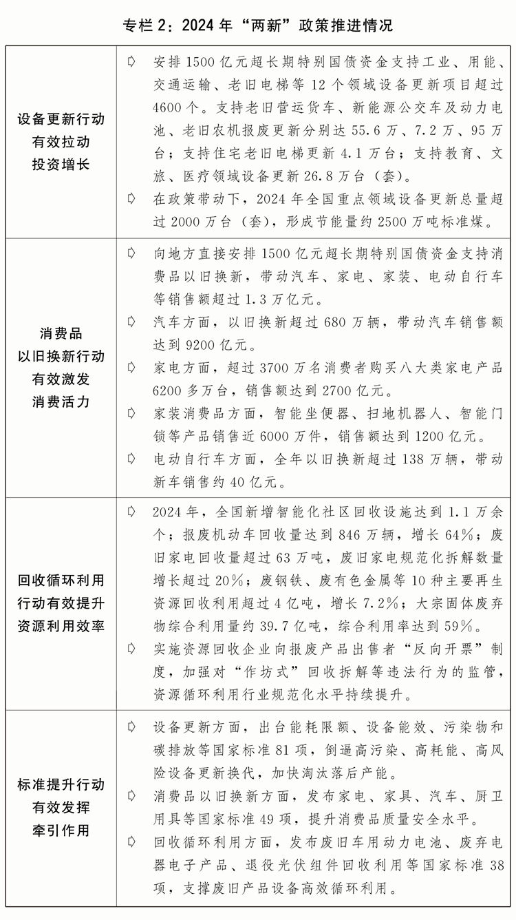 一是科技立异系统持续健全。充实阐扬新型举国体系体例劣势,强化国度计谋科技力量,全面启动实施国度科技严沉专项。国度尝试室系统扶植稳步推进。加速推进严沉科技根本设备系统化扶植,提拔全生命周期办理程度,已有39个设备投入运转。健全企业从导的产学研深度融合系统,鞭策成立企业研发预备金轨制,支撑创业投资高质量成长,培育强大科技领军企业、专精特新中小企业,企业科技立异从体地位不竭强化。二是严沉立异持续出现。“嫦娥六号”正在人类汗青上初次实现月球后背采样前往。“空间地面模仿安拆”建成投用。我国首艘超深水大洋钻探船“胡想”号建成入列。第五座南极调查坐秦岭坐开坐。集成电全财产链焦点手艺加快冲破,鸿蒙操做系统生态兴旺成长。第三代自从超导量子计较机“本源悟空”上线处置器正在量子计较优胜性测试上成立新劣势。正在全球初次发觉引力子激发。水冷磁体手艺打破世界记载,碳基新材料范畴取得原创性冲破。人工智能大模子实现冲破。人形机械人等智能终端新业态加快出现。1000千瓦级平易近用涡轴策动机取得型号及格证,300兆瓦级F级沉型燃气轮机完成初次满负荷试验,全球最大26兆瓦级海优势力发电机组总拆下线。第三代自从产权核电“国和一号”示范工程首堆建成投运。时速450公里的CR450中国尺度高速动车组完成设想制制。全球最大无人货运飞机总拆下线。三是教育科技人才一体推进迈出新程序。完美人才培育取经济社会成长需求适配机制,深化高档教育分析,扩大根本学科和国度环节急需范畴研究生培育规模。制定推进各类立异从体协同联动、立异要素顺畅流动取优化设置装备摆设的政策。深化科技赋权。深切推进科技人才分类评价,加强青年科技人才全链条培育。(四)积极激发消费活力、提高投资效益,内需潜力不竭。全年社会消费品零售总额增加3。5%,固定资产投资(不含农户)增加3。2%,最终消费收入、本钱构成总额对经济增加的贡献率别离为44。5%、25。2%。一是实物消费不变扩大。积极推进住房、汽车、电子产物、家具家拆等大消费。将全国层面贸易性小我住房贷款最低首付比例同一降至15%,打消全国层面贸易性小我住房贷款利率政策下限,降低存量房贷利率和小我住房公积金贷款利率,降低住房买卖、开辟环节的税收承担,四时度全国新房、二手房买卖网签面积环比别离增加21。6%、7。7%。开展新能源汽车促消费勾当,全年汽车销量达3143。6万辆、增加4。5%,此中,新能源汽车销量达1287万辆、增加35。5%,市场拥有率达40。9%。发布升级和立异消费品指南(轻工第十一批)。深切鞭策新能源汽车、绿色建材、绿色智能家电等下乡,村落消费品零售额增加4。3%。曲播带货、立即零售等新业态带动感化持续阐扬,实物商品网上零售额达12。8万亿元、增加6。5%。二是办事消费增加较快。出台推进办事消费高质量成长的看法,完美办事消费支撑政策。全年办事零售额增加6。2%、高于商品零售额增速3个百分点。完美全国年节及留念日放假法子,新增2天节假日。出台推进文化和旅逛消费的支撑政策,鼎力成长县域旅逛、冰雪旅逛、研学旅逛、红色旅逛、旅逛列车等,国内出逛人次、居平易近出逛破费别离增加14。8%、17。1%。文娱消费持续增加,体育消费日益升温,马拉松、骑行、户外活动等加快普通化,赛事经济日益成为新增加点。深切实施数字消费提拔步履,通信消息办事类零售额连结两位数增加。印发关于成长银发经济促进老年人福祉的看法,推进老年人康养、文旅等消费潜力。提拔外籍人员入境旅逛领取便当化程度,片面免签国度增至38个,互免签证国度增至26个,将过境免签外国人正在境内逗留时间耽误至240小时,入境旅客1。32亿人次、增加60。8%。三是消费持续优化。开展“消费推进年”等勾当,出力打制消费新场景培育消费新增加点。鞭策老字号守正立异成长,全国中华老字号数量扩围至1455个。因地制宜扶植新消费品牌孵化。深化国际消费核心城市培育扶植,鼎力成长聪慧商圈,累计扶植一刻钟便平易近糊口圈4335个、办事社区居平易近1。07亿人。完美县域农村消费根本设备。出台实施《消费者权益保实施条例》,加强消费范畴监管法律,开展2024年儿童和学生用品平安守护步履。四是投资感化无效阐扬。统筹用好地方预算内投资、处所专项债券、2023年增发国债、超持久出格国债等支撑沉点项目扶植。优化地方预算内投资投向范畴,强化项目监视办理。优化处所专项债券办理机制,实施专项债券投向范畴“负面清单”办理。加强项目谋划储蓄,强化用地、用海、用能、环评等要素保障,加强项目全生命周期办理。鞭策“十四五”规划102项严沉工程取得积极进展。2023年1万亿元增发国债支撑的1。5万个项目加速实施,一多量灾后恢复沉建和防灾减灾救灾能力提拔项目按期建成。五是平易近间投资健康成长。扣除房地产开辟的平易近间投资增加6%,制制业平易近间投资增加10。8%。5个新核准核电项目引入平易近间本钱参股比例达10%。规范实施和社会本钱合做(PPP)新机制。全年依托项目推介平台吸引平易近间本钱参取项目531个、总投资4136亿元。成立全国沉点平易近间投资项目库,持续加强资金和要素支撑。建立根本设备范畴不动产投资信任基金(REITs)常态化刊行轨制系统,累计62个项目