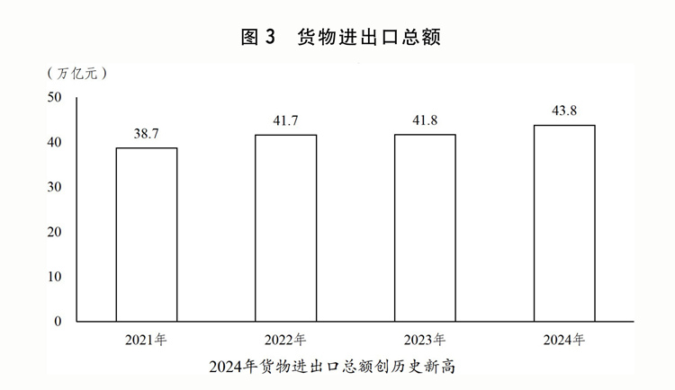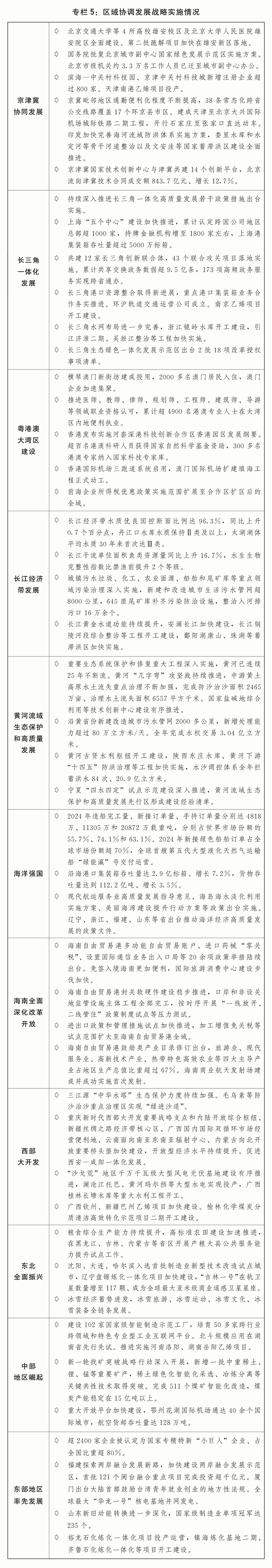 一是高质量共建“一带一”成效显著。成功召开第四次“一带一”扶植工做座谈会。共建“一带一”高质量成长八项步履沉点使命成功推进,对共建“一带一”国度进出口总额增加6。4%,占我国进出口总额的比沉初次跨越50%。取巴西、非盟等23个国度和国际组织签订共建“一带一”合做规划。2024年中非合做论坛峰会成功举办。高质量举办首届中国-海合会国度财产取投资合做论坛、大湄公河次流域经济合做第八次带领人会议。统筹严沉标记性工程和“小而美”平易近生项目扶植取得主要进展。中吉乌铁举行项目启动典礼,中老铁、雅万高铁平安不变运营,中巴经济走廊“升级版”扶植稳步推进,东线天然气管道全线提前建成、满输运转。中泰铁、匈塞铁扶植取得新,中越跨境尺度轨铁取得积极进展,中欧跨里海中转快运开通。鲁班工坊、菌草手艺、“丝一家亲”等平易近生项目结实推进。中欧班列不变畅达运转,结构扶植一批中欧班列集结核心,全年开行1。94万列,累计开行冲破10万列,灵通欧洲26个国度229个城市。“丝海运”定名航路个口岸,空中丝绸之通航56个国度107个城市。积极成长“丝电商”,取塔吉克斯坦、巴林等33个国度成立双边电商合做机制。二是外贸出口对经济增加贡献增大。出台关于推进外贸不变增加、拓展跨境电商出口推进海外仓扶植、鞭策办事商业和数字商业成长的政策,货色和办事净出口对经济增加的贡献率达30。3%。进博会、广交会、服贸会、投洽会、博览会等严沉展会成功举办。出台结实推进高程度对外更鼎力度吸引和操纵外资步履方案。发布外商投资准入出格办理办法(负面清单)(2024年版),制制业范畴外资准入办法全面打消。推进办事业扩大分析试点示范,开展增值电信、生物手艺、独资病院试点。发布实施全国版和自贸试验区版跨境办事商业负面清单。推出第八批标记性严沉外资项目。健全境外投资办理办事系统。三是平台感化更好阐扬。加强全国各类平台统筹规划结构。实施商业试验区提拔计谋,22个自贸试验区进出口额达到8。45万亿元。加速推进跨境电商分析试验区扶植,区内企业跨境电商商业规模占全国比沉跨越95%。海关特殊监管区域全年实现进出口额8。37万亿元,增加4。6%。出台浙江省义乌市深化国际商业分析总体方案、支撑姑苏工业园区深化立异分析试验的若干办法。设立延吉-长白沉点开辟试验区,持续鞭策长吉图开辟先导区扶植,《(大乌苏里岛)结合开辟规划》正式签订,深化面向东北亚合做。西部陆海新通道辐射范畴拓展至125个国度和地域的542个口岸。四是多双边经贸合做持续深化。果断多边商业体系体例,积极鞭策世贸组织,鞭策告竣投资便当化协定、电子商务协定。全面高质量实施《区域全面经济伙伴关系协定》。积极鞭策我国插手《数字经济伙伴关系协定》《全面取前进跨承平洋伙伴关系协定》历程。正在二十国集团、金砖国度、亚太经合组织等多边区域机制下,鞭策各方环绕商业投资化便当化、商业数字化、供应链互联互通、可持续成长等告竣多份文件。实施取尼加拉瓜、厄瓜多尔、塞尔维亚的自贸协定,取新加坡的自贸协定进一步升级议定书。签订取白俄罗斯的办事商业和投资协定,取秘鲁的自贸协定升级议定书。中国-东盟商业区3。0版构和本色性完成。(七)统筹推进新型城镇化和村落全面复兴,城乡融合成长取得新进展。印发实施以报酬本的新型城镇化计谋五年步履打算、村落全面复兴规划和加速扶植农业强国规划,城乡成长协调性持续加强。一是脱贫攻对峙续巩固拓展。持续健全完美防止返贫致贫动态监测和帮扶机制。用好工具部协做、定点帮扶机制,沉点区域帮扶成效较着。推进帮扶财产高质量成长,832个脱贫县从导财产总产值跨越1。7万亿元。开展支撑易地搬家安设区可持续成长专项步履,易地搬家脱贫劳动力就业率跨越95%。鼎力实施以工代赈,全年吸纳330多万名低收入群众务工就业。深切实施防止返贫就业攻坚步履,脱贫生齿务工规模跨越3300万人。开展消费帮扶“新春步履”“金秋步履”,鞭策成立产销对接关系和财产协做系统,全年消费帮扶总额超4500亿元。二是现代村落财产成长程度稳步提拔。粮食总产量再创汗青新高,初次跃上1。4万亿斤新台阶。“菜篮子”产物供给丰裕。深切践行大食物不雅,粮经饲统筹、农林牧渔连系、动物动物微生物并举的多元化食物供给系统加速建立。加速实施农业严沉科技立异项目,农机配备补短板步履取得新冲破。支撑农村财产融合成长,农产物加工业效益改善,村落旅逛和特色文化财产富平易近感化日益显著。新型农业运营从体提质增效,109。4万个运营性从体年办事面积跨越21。4亿亩次。三是村落扶植取得新成效。进修使用“万万工程”经验,加速推进宜居宜业和美村落扶植,落实农村人居整治提拔五年步履方案、村落扶植步履实施方案、金融支撑村落全面复兴专项步履。全国农村自来水普及率达到94%,规模化供水工程笼盖农村生齿比例达到65%。健全农村糊口垃圾收运措置系统,支撑各地因地制宜选择合适的改厕模式,分类梯次推进糊口污水管理,全国糊口垃圾获得收运处置的行政村比例不变正在90%以上,农村卫生茅厕普及率达75%摆布,农村糊口污水管理(管控)率达45%以上。深切推进农村客货邮融合成长。农村养老办事系