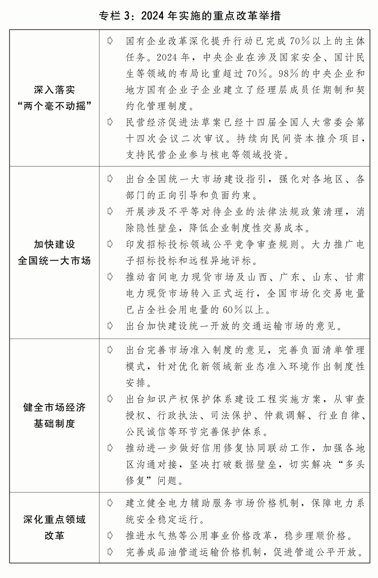 四是政策协和谐预期指导不竭加强。健全宏不雅政策取向分歧性评估机制,加强各类政策统筹协调,确保同向发力、构成合力。多渠道多角度多条理开展经济形势和严沉政策宣传解读,自动回应社会关心。(二)进一步全面深化,成长动力活力不竭加强。认实落实党的二十届三中全会摆设的主要行动,深化经济体系体例,经济成长内活泼力、立异活力持续激发。一是“两个毫不”要求进一步落实落细。深切实施国有企业深化提拔步履。深化国有经济结构优化和布局调整,健全国有企业投资办理轨制,完美国有企业分类查核评价系统。加速鞭策平易近营经济推进法立法。成立推进平易近营经济成长强大部际联席会议轨制,健全国度、省、市、县多层级政企常态化沟通交换和问题处理机制,上线运转平易近营经济成长分析办事平台,帮帮平易近营企业处理现实问题。开展清理拖欠企业账款专项步履。支撑专精特新中小企业成长,累计培育“小巨人”企业1。46万家。传承“晋江经验”,实施新时代平易近营企业家培育赋能打算,鼎力企业家。出台完美中国特色现代企业轨制的看法,加速培育世界一流企业。二是全国同一大市场扶植无力无效。出台全国同一大市场扶植,试点开展运营从体勾当发生地统计。京津冀、长三角、成渝等地域率先启动推进区域市场一体化摸索实践。提拔商品市场联通程度,跨互联网平台间结算壁垒。同一的要素资本市场扶植深切推进。多条理多品类多功能的全国同一电力市场系统初步构成。规范处所招商引资行为。鞭策投标投标市场规范健康成长,制定评标专家和评标专家库办理法子。开展沉点范畴凸起问题专项管理,一批处所、市场朋分问题获得处理。规范涉企行政查抄,规范和监视罚款设定取实施,开展涉企违规收费专项整治。发布全国优化营商立异实践案例,启动京津冀一流营商扶植三年步履。依理涉企行政复议案件7。9万件,改正企业权益的违法或不妥行政行为6516件,帮力营制化营商。三是市场经济根本轨制不竭健全。出台完美市场准入轨制的看法,全面开展市场准入效能评估。实施学问产权系统扶植工程,全面推进专利使用专项步履,推进学问产权平易近事、行政、刑事案件“三合一”审讯机制。深化农村集体产权轨制,深化农村集体运营性扶植用地入市试点。出台实施公允合作审查条例。加强反垄断和反不合理合作监管法律。完美信用修复机制,加强跨部分信用修复成果互认。四是沉点范畴走深走实。鞭策出台法。水资本费改税进入全面试点阶段。出台加强监管防备风险鞭策安全业、本钱市场、期货市场高质量成长的看法。鞭策中持久资金入市,完美股份减持、量化买卖、融券等轨制法则和监管办法。健全天然垄断环节监管体系体例机制。鼎力推进绿证绿电市场扶植,绿证核发和绿电买卖根基实现全笼盖。完美价钱管理机制,推进电价市场化,健全成品油管道运输价钱机制,深化公用事业和公共办事价钱,成立公共数据资本授权运营价钱构成机制,新增近8000万亩耕地灌溉面积实施农业水价分析。深圳分析试点首批授权事项全面落地、新一批授权事项有序实施,浦东新区、厦门分析试点首批授权事项大都构成落地场景。党政机关和国有企事业单元培训疗养机构全面完成。稳妥有序实施渐进式延迟退休春秋,出台实施弹性退休轨制暂行法子。