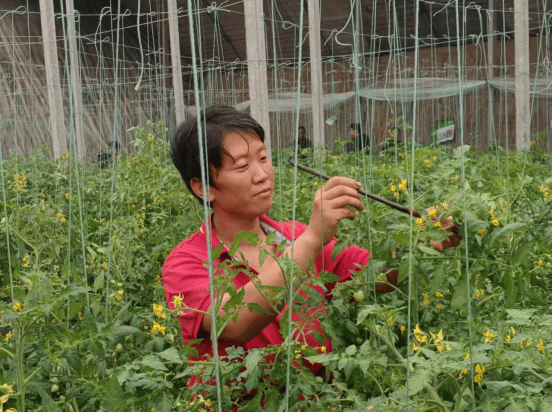 商河县吕常东村丽家种了2亩西红柿、2亩辣椒,获得中国人寿财险分公司寡照指数赔款后,种植蔬菜的决心更脚了。图为丽正正在给盛花期的西红柿人工授粉。