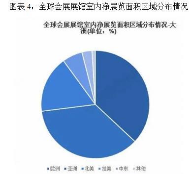 全球会展展馆室内净展览面积达到4200万平方米,此中欧洲和亚洲是全球会展展馆容量最大的2个区域,占比别离达到37%和36%。